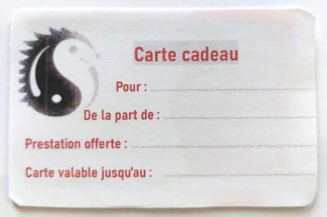 La carte cadeau permet d’offrir une séance personnalisée parmi l’ensemble des soins proposés : acupuncture, moxibustion, massage Tuina, ventouses, pharmacopée, conseils diététiques ou conseils en Qi Gong.